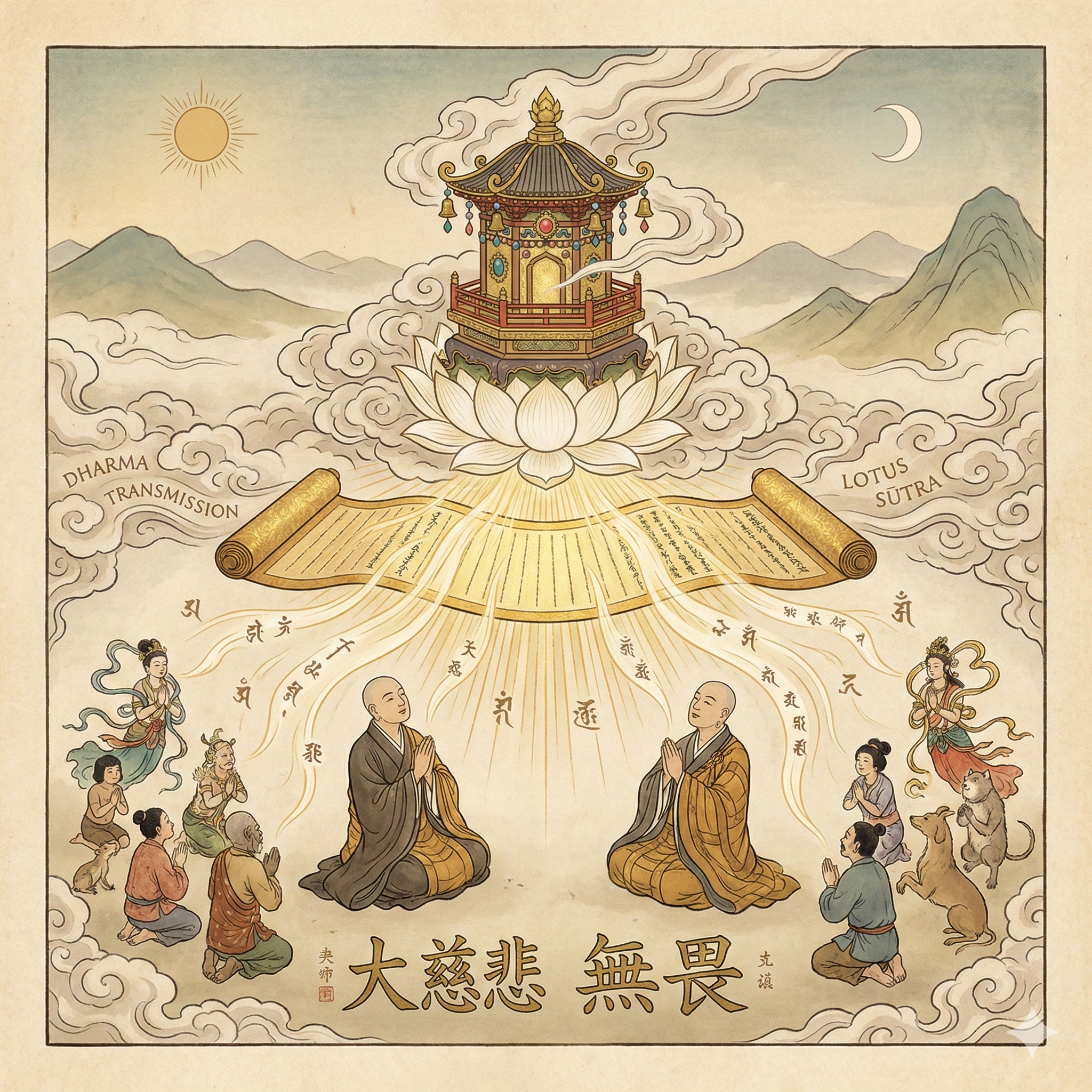 I am developing the symbolic illustration further. My focus has shifted to the hōtō and its placement on a lotus throne, which will be central to the composition. The Dharma's transmission is now being visually represented by a flowing scroll emanating from the tower, alongside praying figures and clouds. I plan to incorporate the required kanji and the traditional art style, within the square format. The aim is to encapsulate the message of compassion and fearlessness.