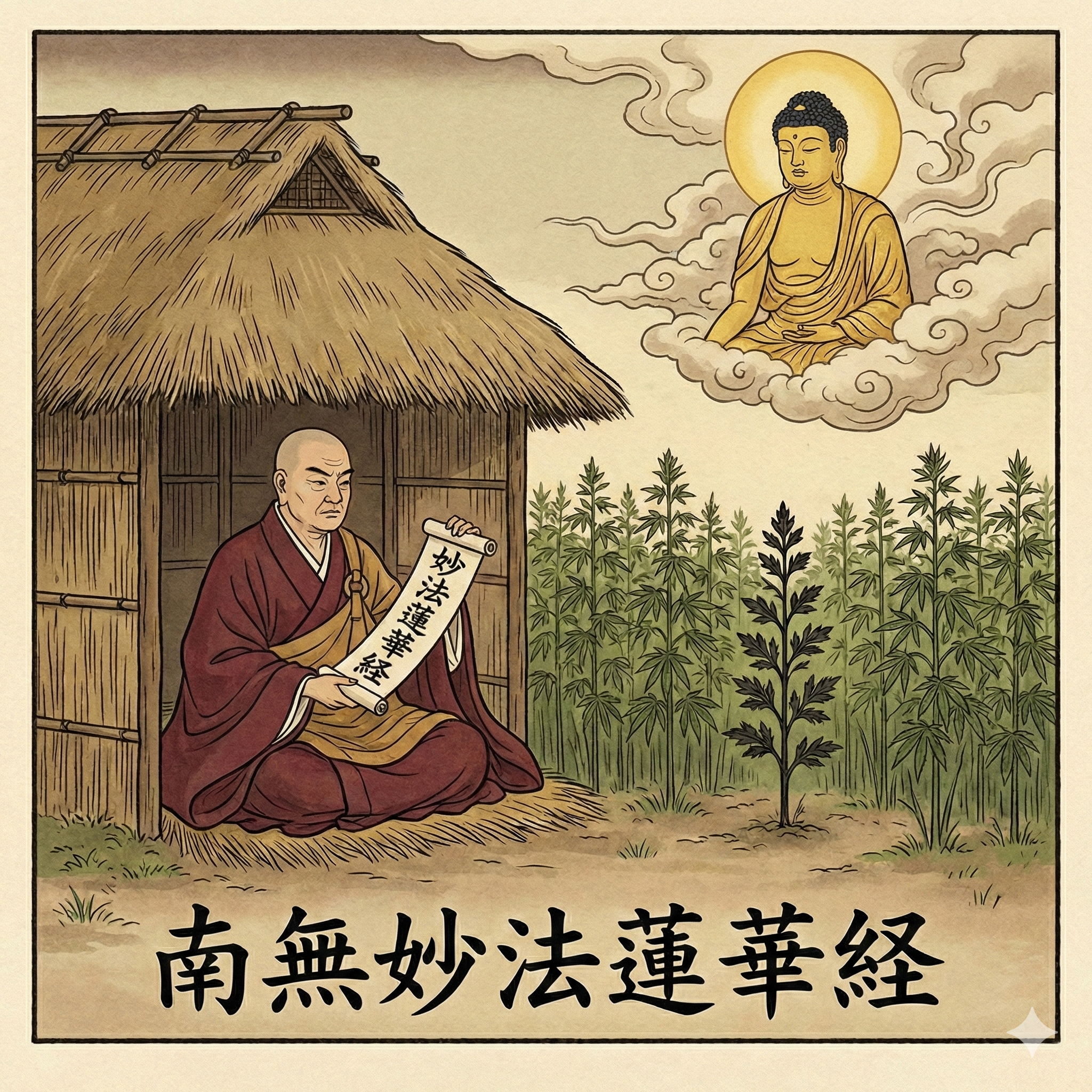 I'm verifying the illustration's correspondence with the prompt. The image presents a square, traditional Japanese-style illustration featuring Nichiren, mugwort in a hemp field, and the Odaimoku. The illustration avoids the use of prohibited elements and limits the presence of text, correctly depicting Shakyamuni Buddha. All requirements appear satisfied.