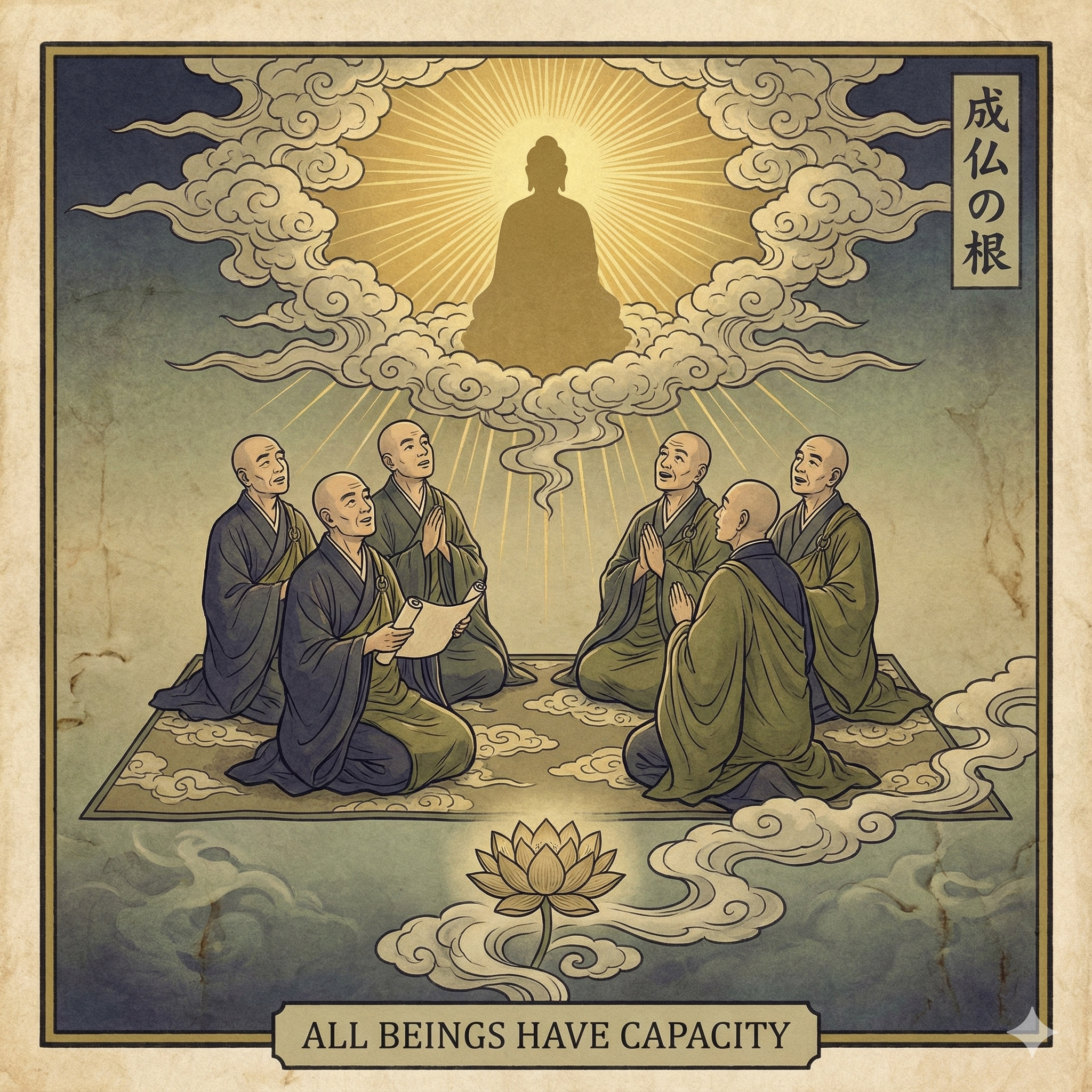 I'm solidifying the composition now. I'm focusing on the monks' expressions and the central figure. I will incorporate light and lotus symbols, with some text. The plan is for the artwork to visually represent the core theme of potential realization.
