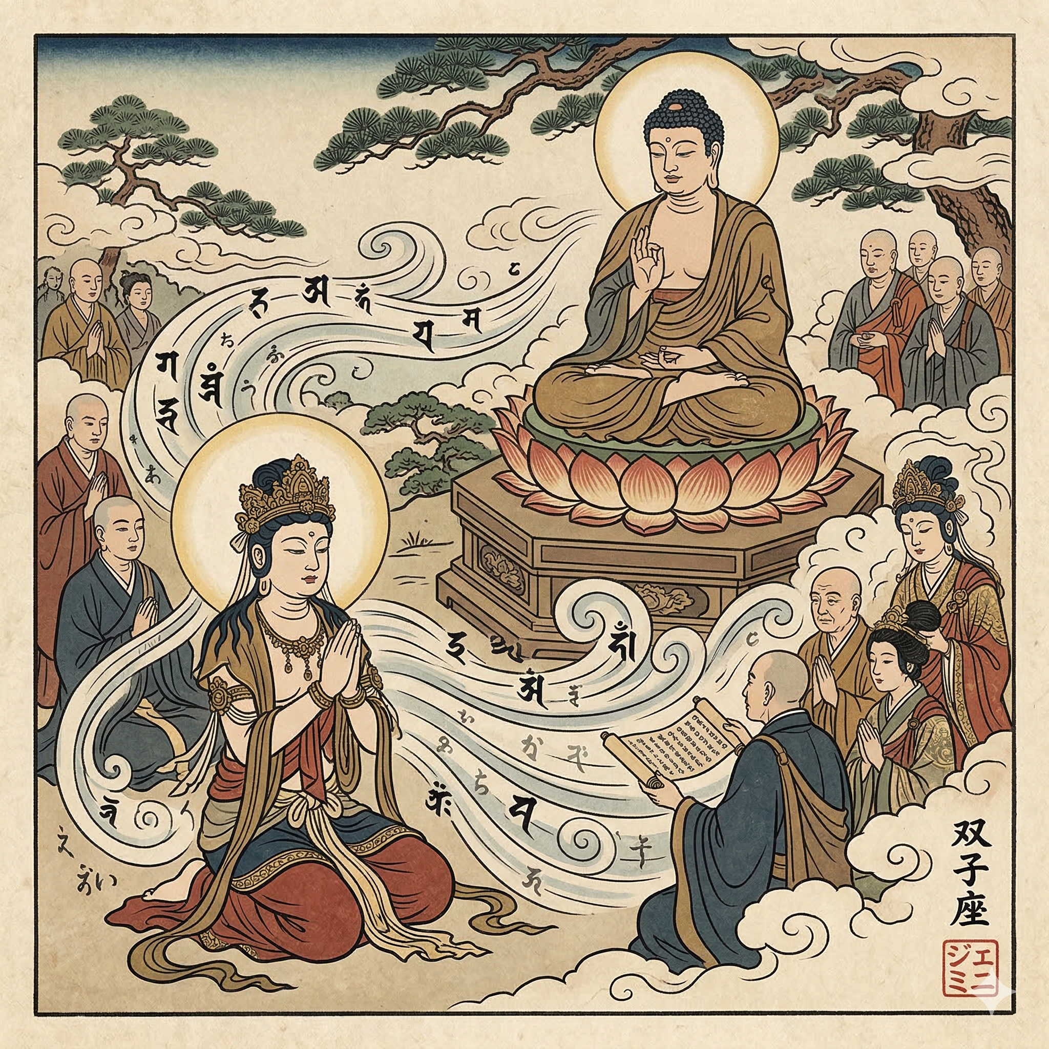 Sanskrit Siddham Script: The prominent, stylized black symbols (like 'ॐ' and 'ह्रीः') are Sanskrit characters from the Siddham script, which are often used in Japanese Buddhism to represent sacred syllables, mantras, and seed syllables.