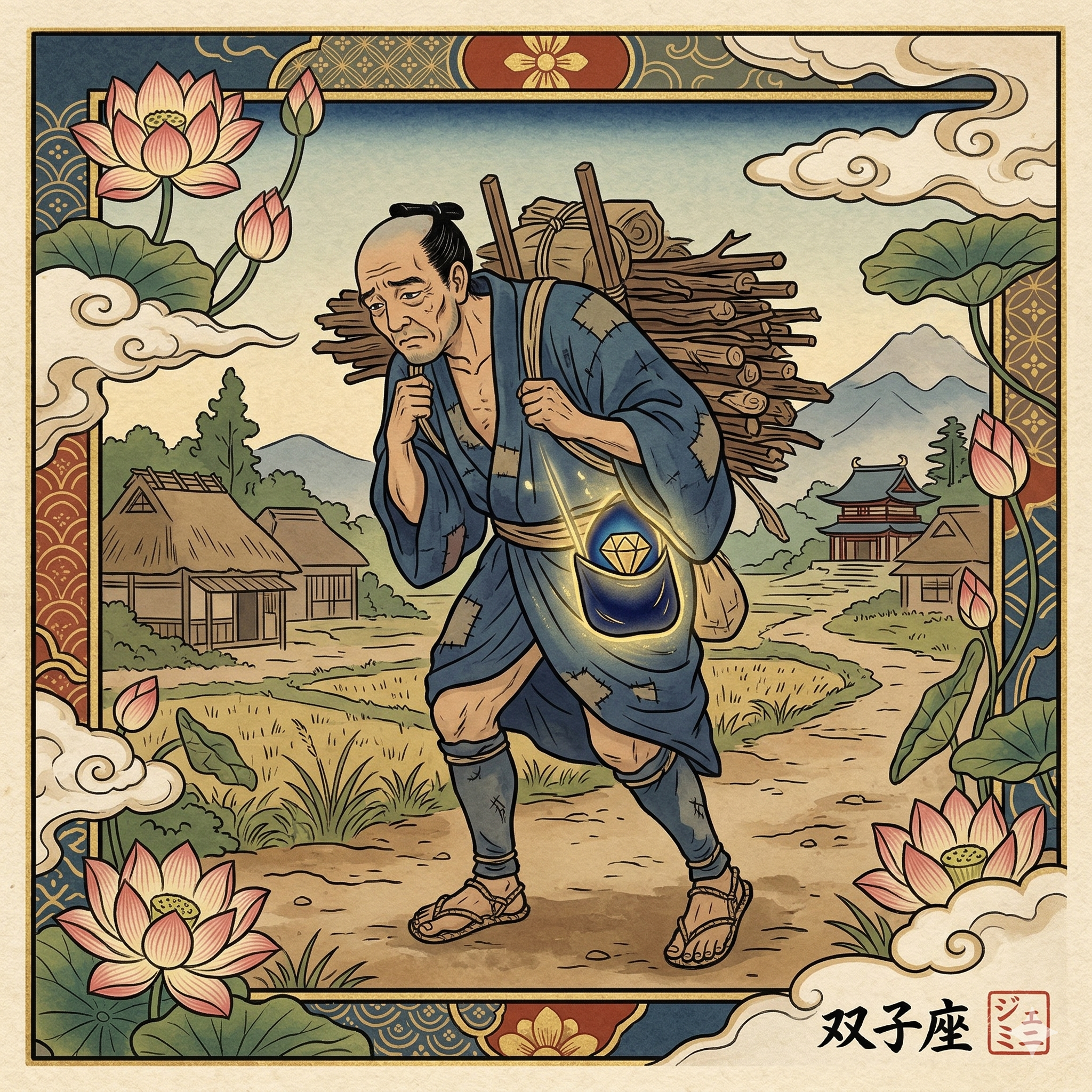 In this square illustration, I have depicted the poor man from Chapter Eight of the Lotus Sūtra as he toils through life, unaware of the treasure he carries. Dressed in ragged robes and hauling a heavy load of firewood, he is visibly exhausted and focused only on survival. Within the stylized border adorned with traditional lotus motifs, a subtle glow illuminates the "priceless gem" tucked into a tear in his sleeve, symbolizing the forgotten jewel of Buddha nature that is within us all, even when we are desperate to satisfy our ordinary desires.