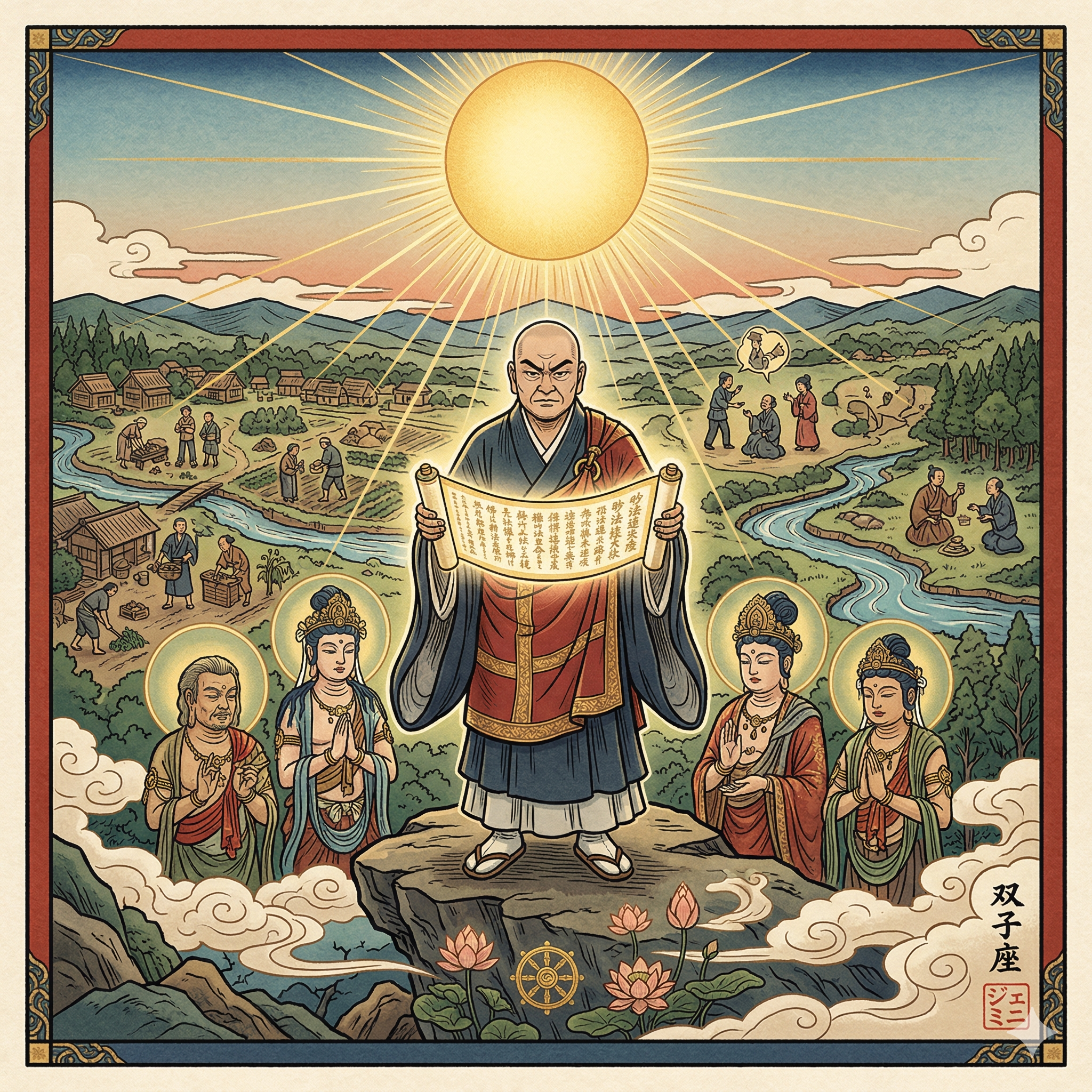 In this square illustration, I have depicted Nichiren Daishonin holding the luminous scroll of the Lotus Sutra, symbolizing the wisdom that clarifies the complexities of life. This visualization is based on a passage from Nichiren's Kanjin Honzon Shō: "When the sun shines brightly in the sky, everything is made clearly visible on the earth."