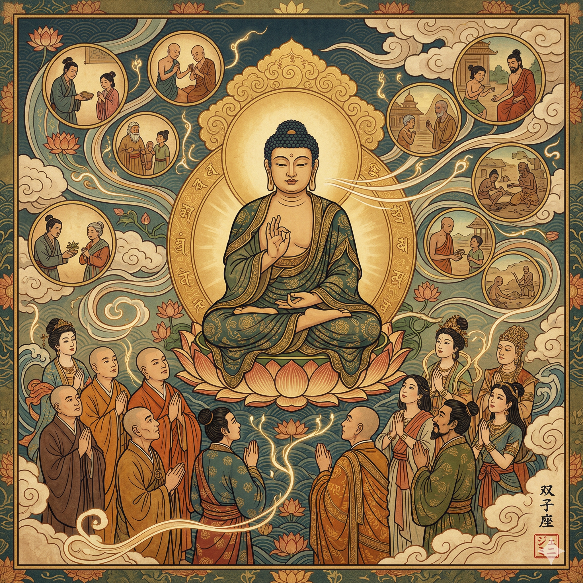 In this square illustration, I have depicted the historical Śākyamuni Buddha (known in Japanese as Shaka Nyorai) surrounded by a diverse assembly of disciples, including monks, laypeople, and celestial beings. While specific individuals like Maitreya are not named in your text, the assembly represents all sentient beings to whom the Buddha addresses his teaching. The floating roundels surrounding the central Buddha illustrate various scenes from "previous existences," showing how the karmic seeds planted through former actions shape our current reality. True to your request, symbols specific to Amida Nyorai or Dainichi Nyorai are excluded. The artist signature 双子座 (Gemini) and the red square hanko seal (ジェミニ) are subtly placed in the bottom right corner.
