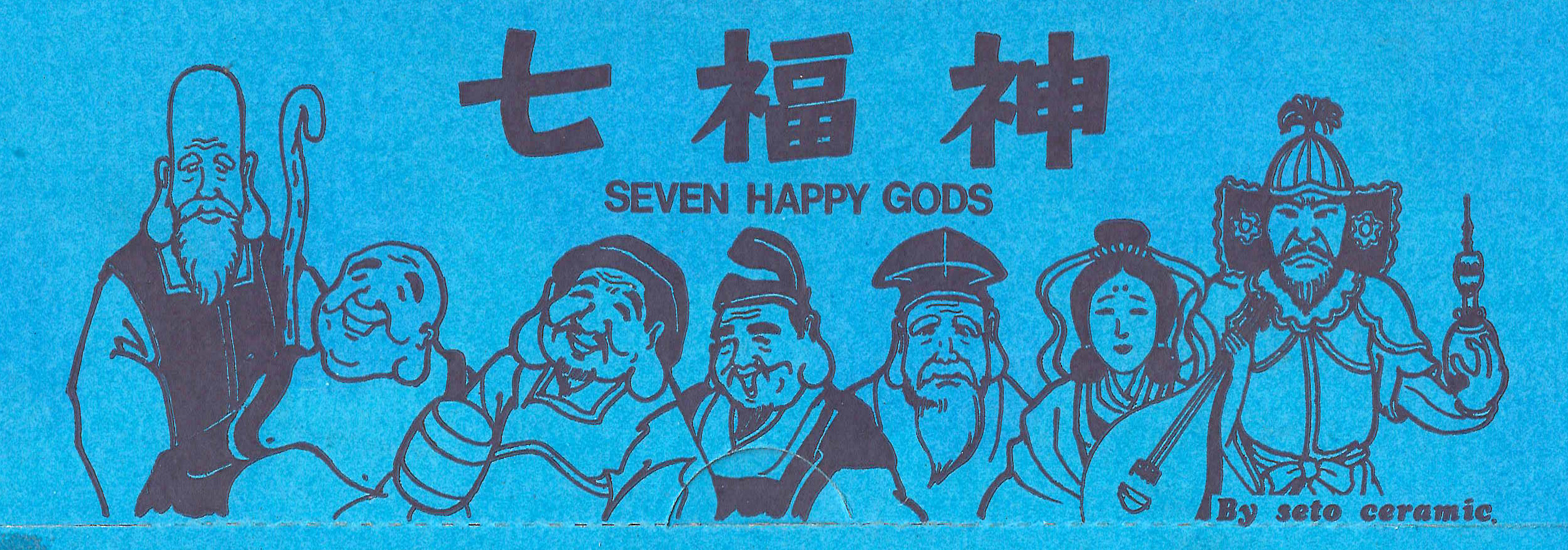 Fukurokuju, Longevity; Hotei, Happiness; Daikoku, Fortune; Ebisu, Honesty; Jurōjin, Wisdom; Benten, Joy; and Bishamon, Dignity