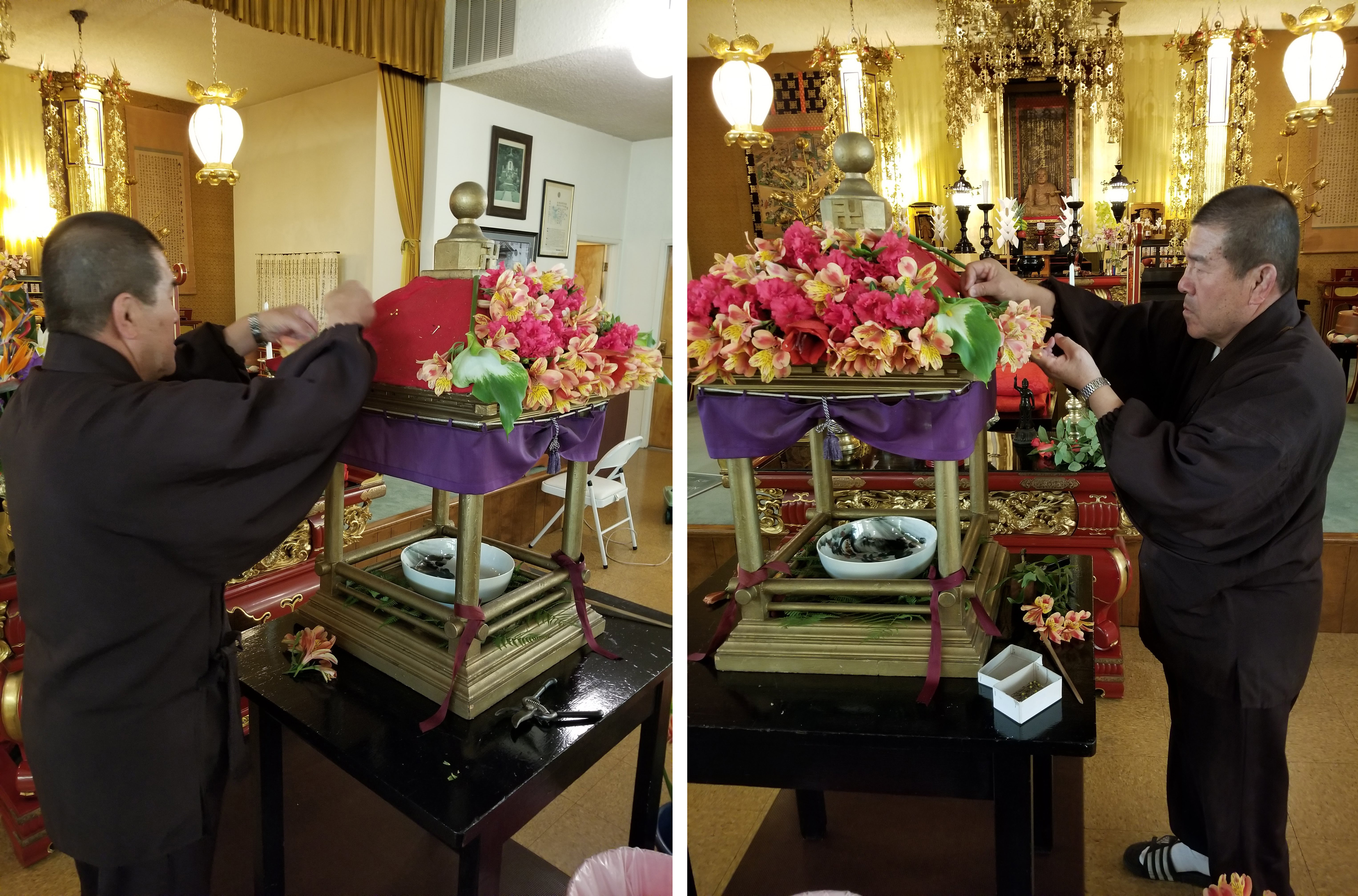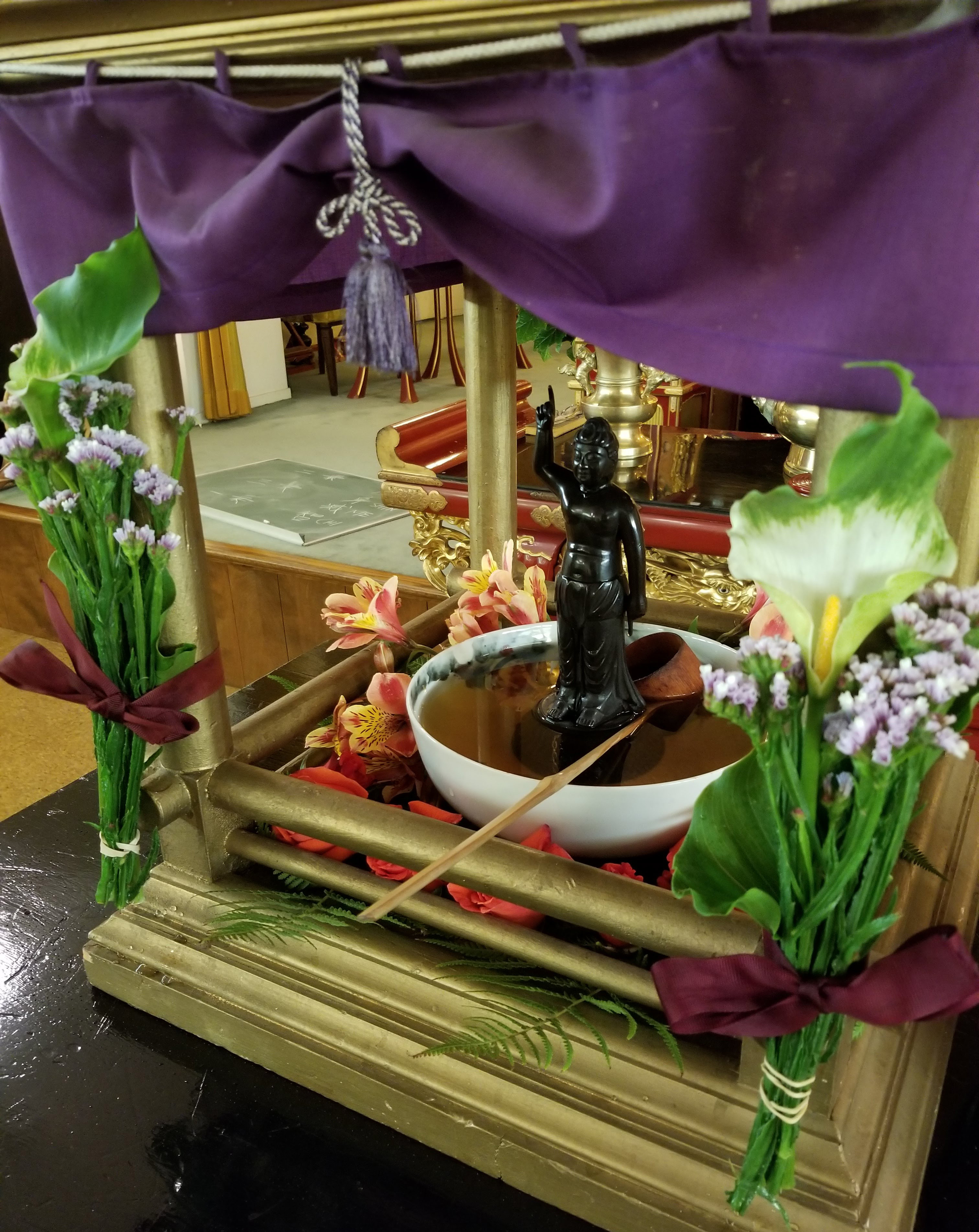 Ven. Kenjo Igarashi attaches flowers to red cloth that lines top of Hanamatsuri structure. The flowers come from the church grounds and from the garden of a church member. The structure itself was handmade by a church member many years ago. Rev. Igarashi explained that members used to be very handy. Finished decoration The child Buddha, with his hands declaring his realm from the heavens to the earth, stands in a pool of sweet tea. During the service parishioners use the ladle to bathe the statue three times.