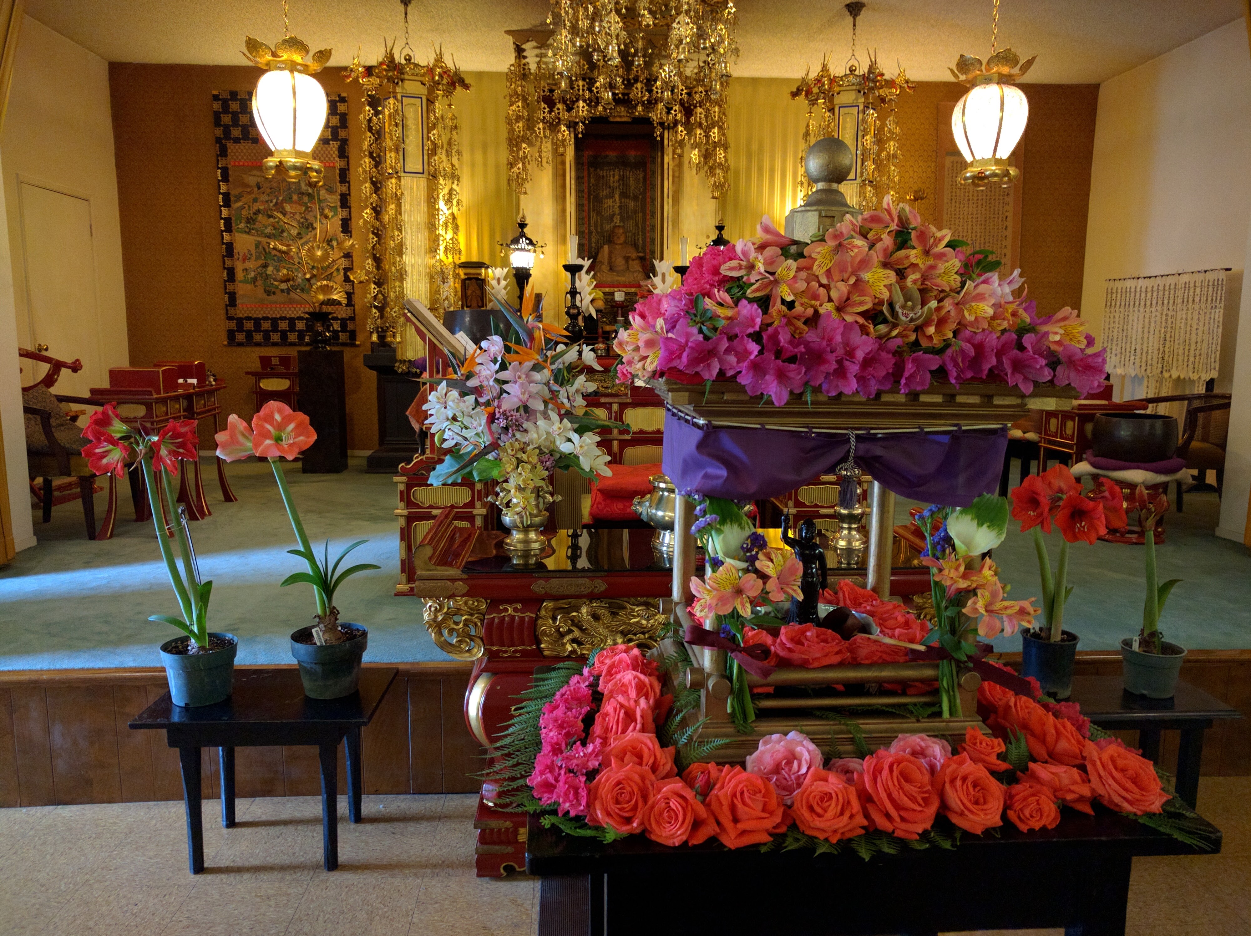 Today was Hanamatsuri, the flower festival service honoring the birth of Sakyamuni Buddha. The beautiful flower arrangement covering the statue of the baby Sakyamuni was done by Ven. Kenjo Igarashi using flowers grown on the grounds of the Sacramento Nichiren Buddhist Church.