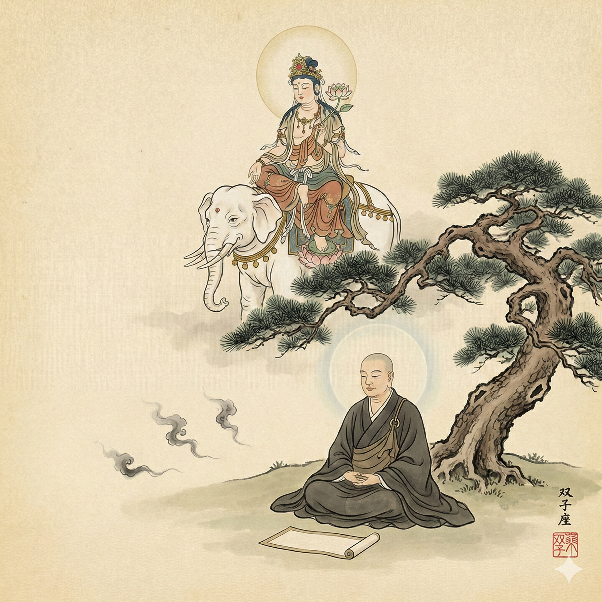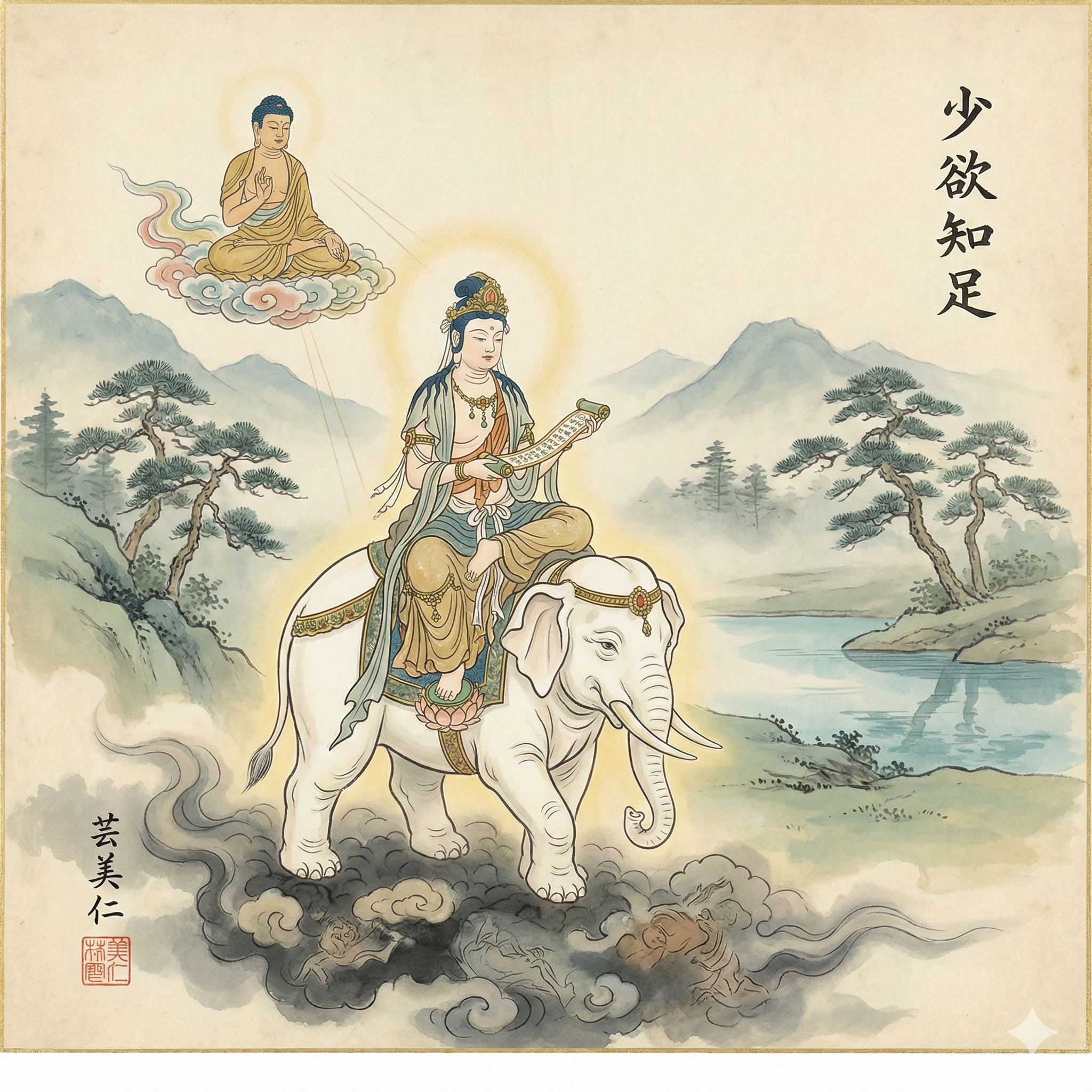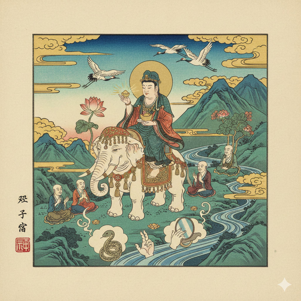 Create a square illustration utilizing Japanese Buddhist iconography.Strict Exclusions: Do not use symbols or images representing Amida Nyorai (Amitabha Buddha) or Dainichi Nyorai (Mahavairocana Buddha).