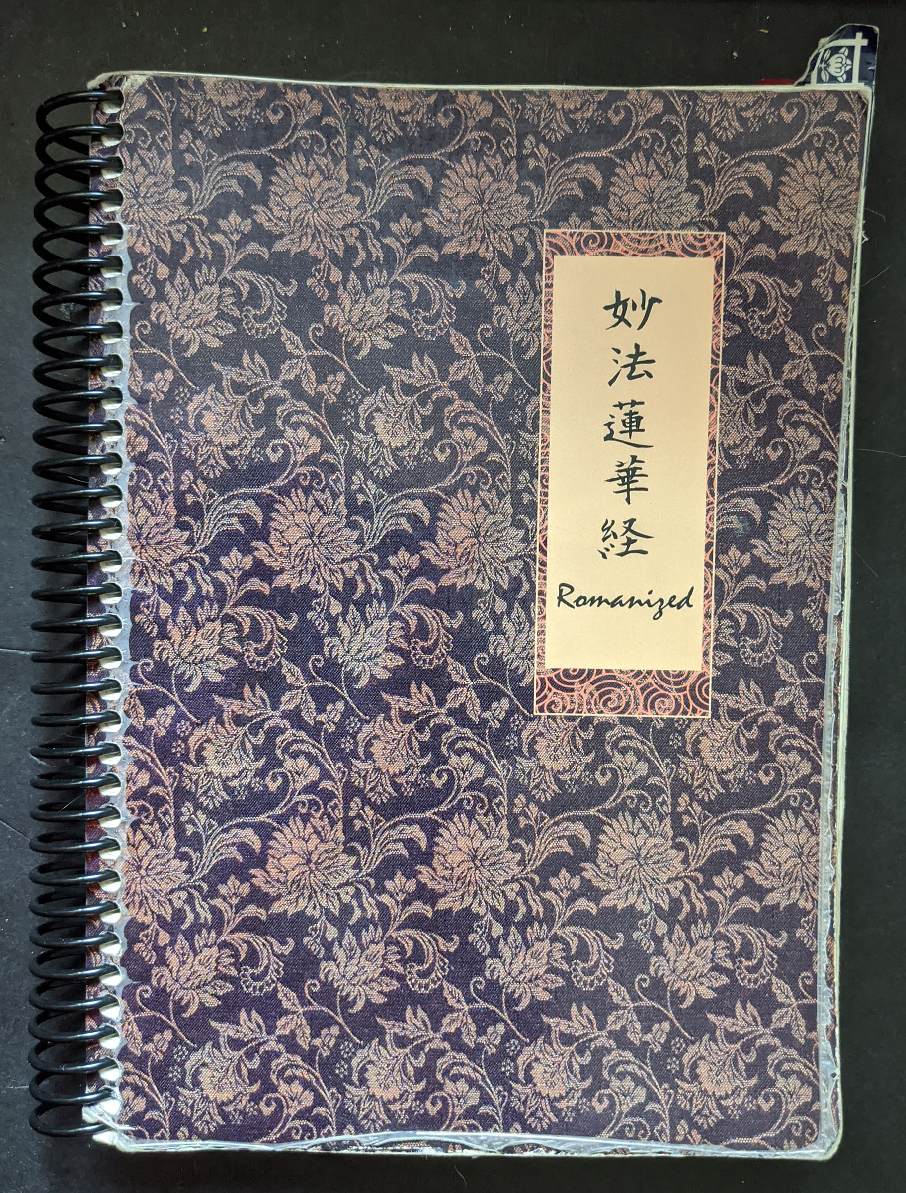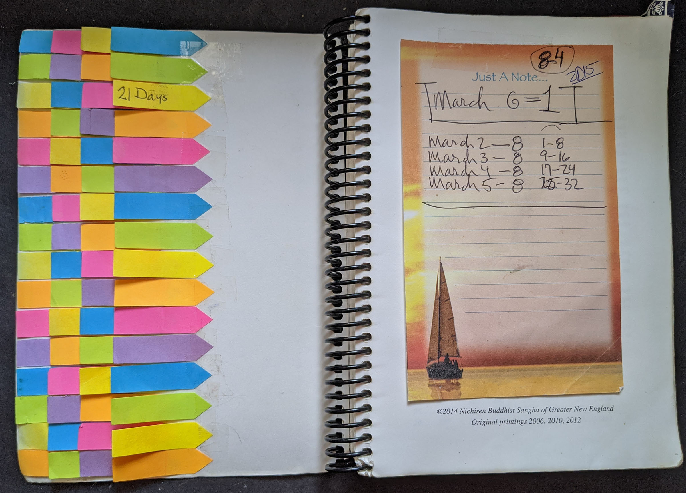 Each morning I pick up Mohorengekyo Romanized and recite that day’s portion of the sutra. The eight fascicles of the sutra are divided into four parts, rendering the sutra’s 28 chapters in 32 parts. I mark my place in the book with a PostIt Note arrow and at the end of the cycle I tape the arrow in the inside cover of my Myohorengekyo Romanized book. When I complete a row of 16 cycles – an arbitrary number that corresponds to the number of arrows that fit in a column – I dutifully comment on the occasion: