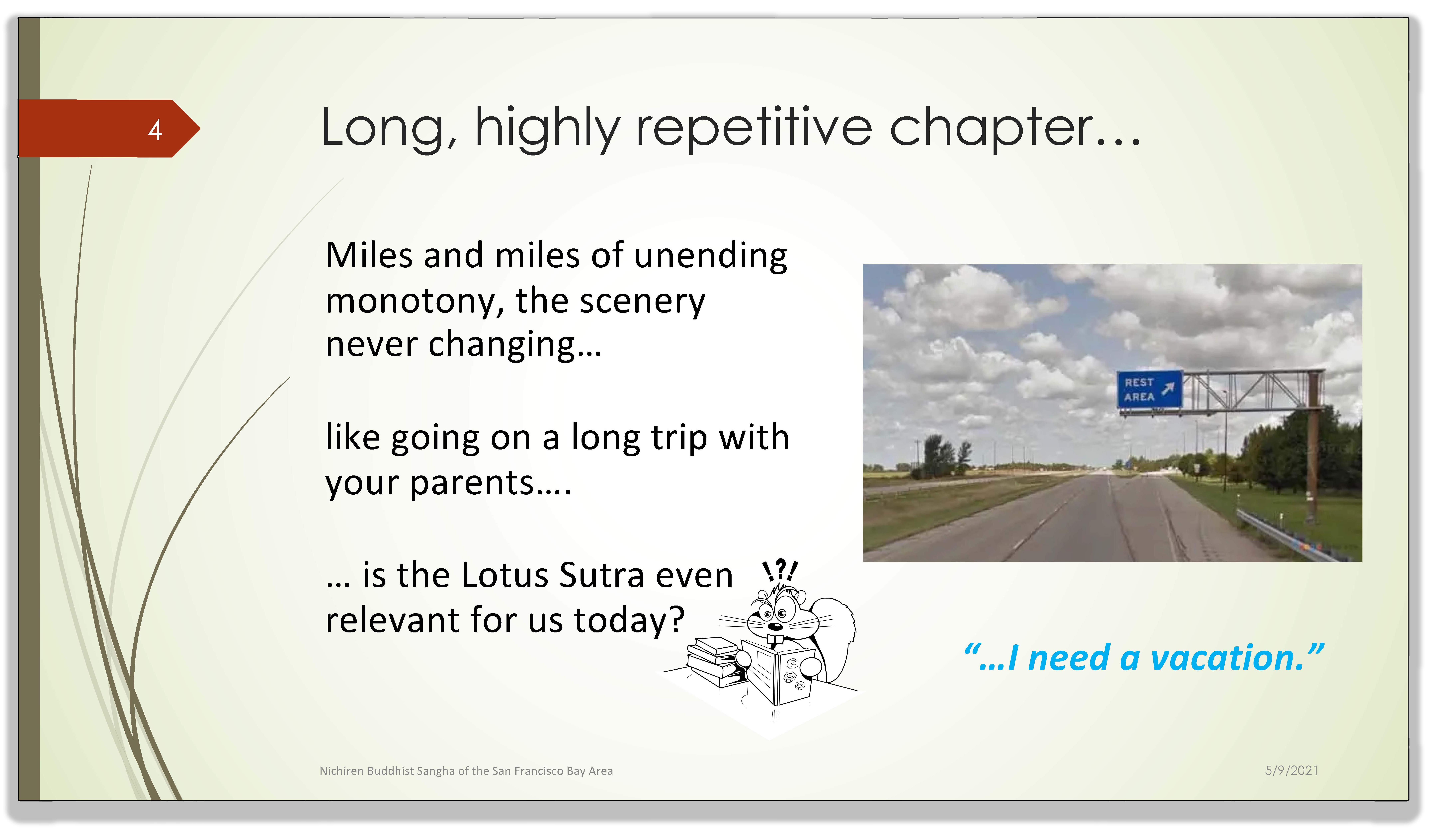 For more than five years I’ve made it my daily practice to read a portion of the Lotus Sutra in shindoku in the morning and then in English in the evening. Even after more than 63 times through the Lotus Sutra, none of the Lotus Sutra is monotonous. It was really very hard to focus on the lecture after this. In reviewing the slide deck afterward, I felt better. The summary points I would have emphasized were mostly mentioned.