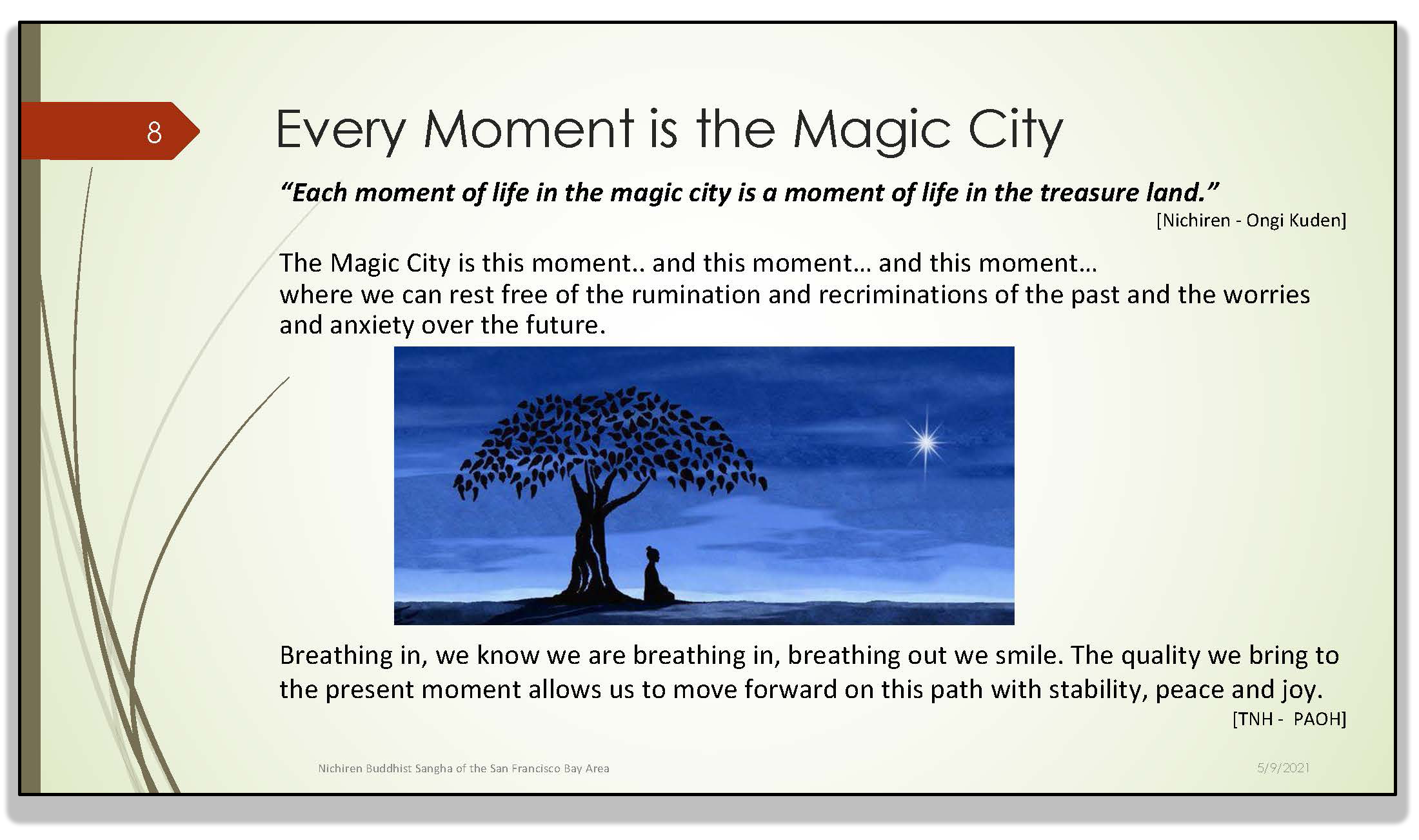 On Sunday, May 9, 2021, I attended the Izu Persecution Service at the Sacramento Nichiren Buddhist Church. As a result, I was unable to attend the Nichiren Buddhist Sangha of the Bay Area lecture on Chapter 7 of the Lotus Sutra, The Parable of a Magic City. Fortunately, the monthly lectures are recorded and posted on YouTube.