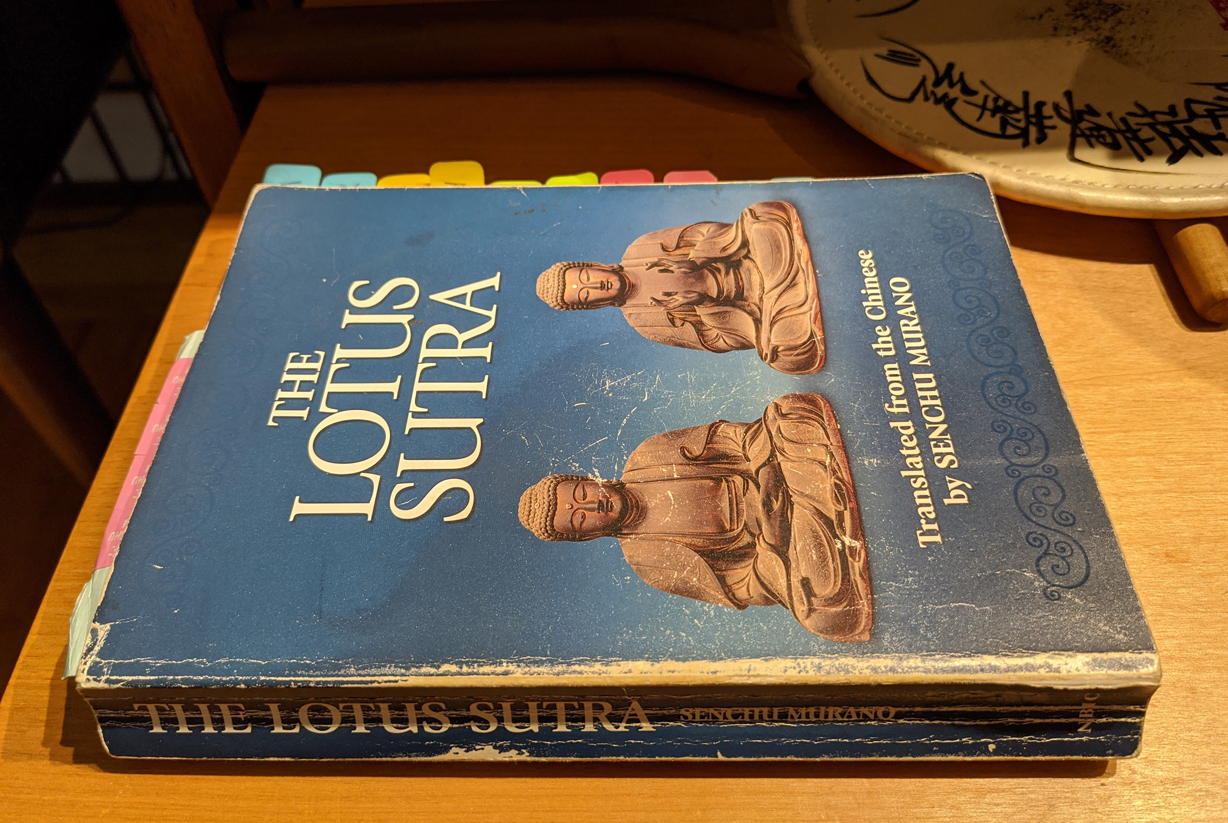 For this evening’s service I welcomed an old friend, my Senchu Murano translation of the Lotus Sutra. For the past 10 cycles through my 32 Days of the Lotus Sutra practice I have been working my way through all of the English translations of Kumarajiva’s Chinese translation of the Lotus Sutra, beginning with “The Scripture of the Lotus Blossom of the Fine Dharma,” the translation of the Lotus Sutra made by Leon Hurvitz, and concluding with Burton Watson’s translation for Soka Gakkai. I suspect that Rissho Kosei-kai’s translation, “The Threefold Lotus Sutra: A Modern Translation for Contemporary Readers,” which was published in 2019, will become the modern standard. The Nichiren Shu Buddhist Sangha of the San Francisco Bay Area intends to use this translation rather than Murano’s for its service booklet. Personally, I’m not convinced that the translators’ aggressive effort to remove gender bias is beneficial. I wrote about this in a January blog post.
