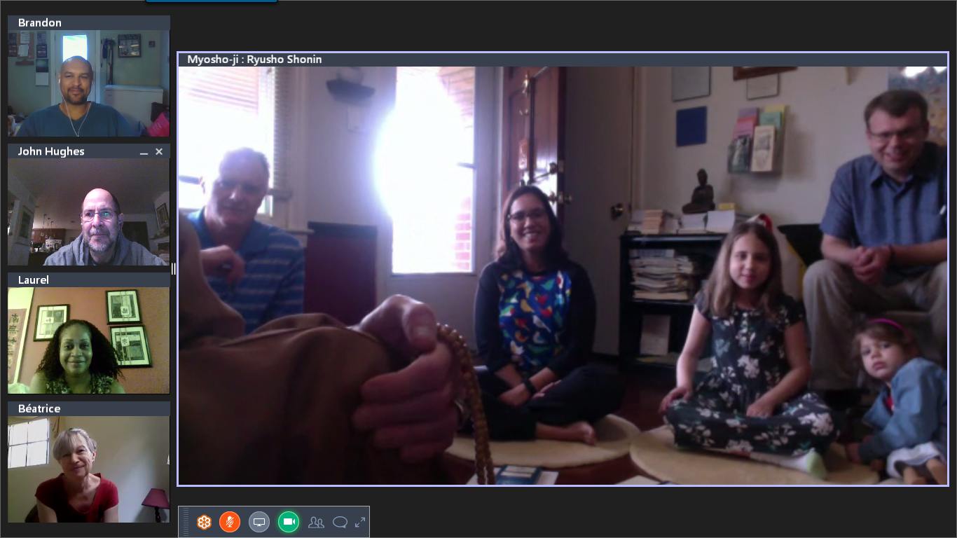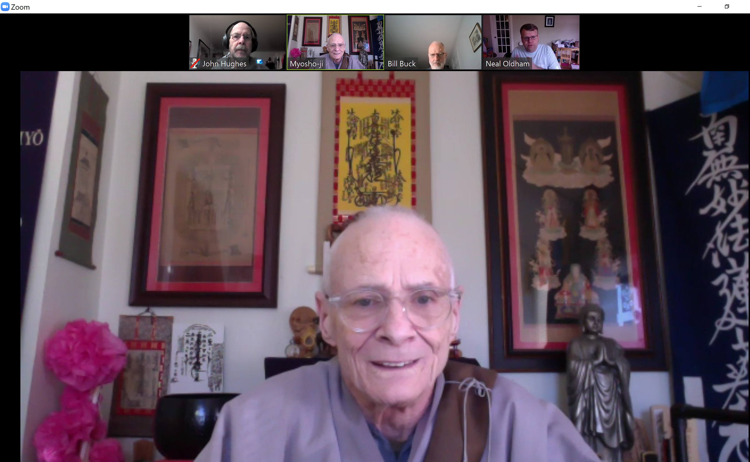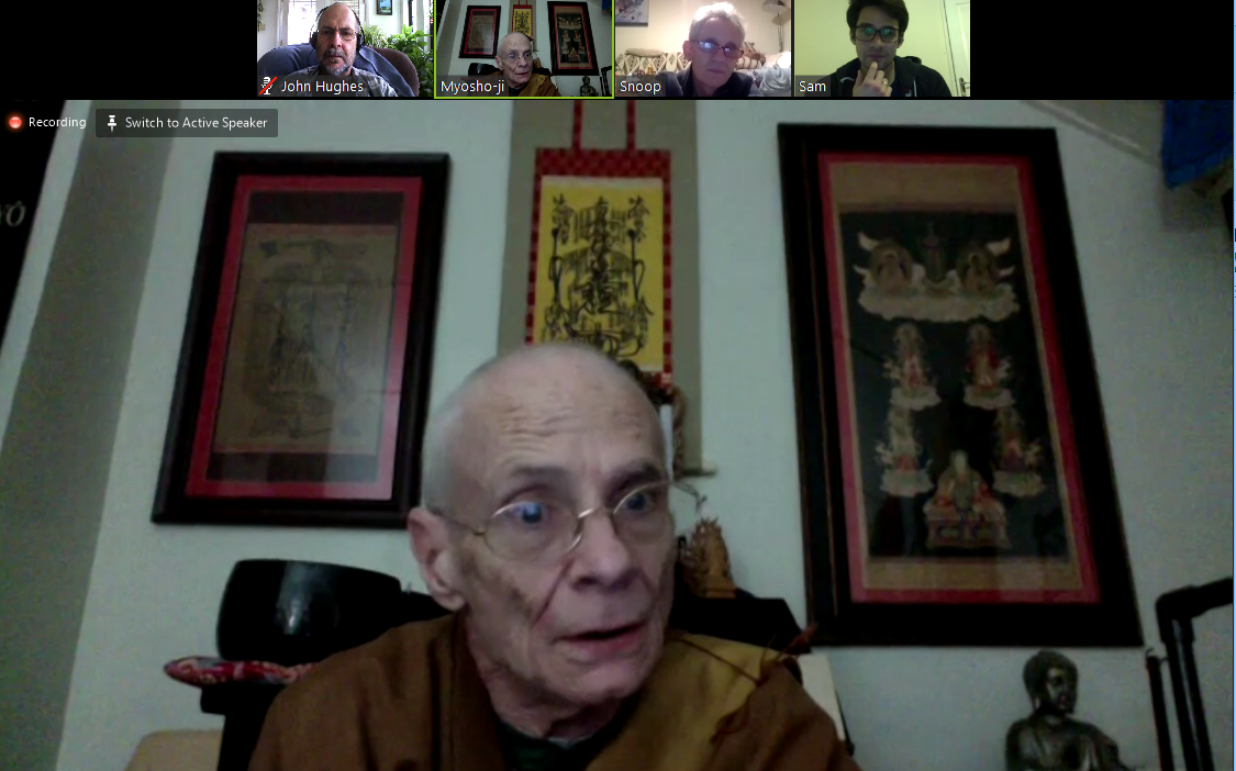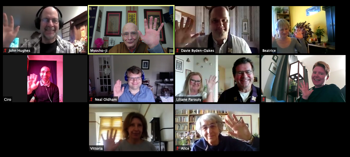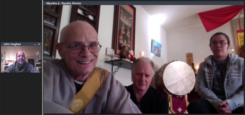 On Nov. 27, 2016, Ryusho created this mandala omamori for me. This and a Kishimojin omamori I purchased from Ryusho became my traveling altar.Screengrab from first service with Ryusho Shonin from Myosho-ji Temple since the move to Syracuse on Feb. 26, 2017.Ryusho Shonin broadcasting April 19, 2017, from his new altar space in Syracuse, NY, during an online discussion of the Shutei Nichiren Shu Hoyo Shiki, the manual that priests and those studying to be priests use.Sunday, March 3, 2019, online service with Rev. Ryusho Jeffus was attended by two couples in France, a young man in England as well as attendees in North Carolina, South Carolina, Iowa and Ohio.On Sept. 15, 2019, Ryusho announced his intention to retire. He outlined his retirement plans. His health, already troublesome, wouldn’t improve.My wife, Mary, and I had lunch with Ryusho Jeffus in Syracuse, NY, on Monday, Nov. 4, 2019A few days after my lunch with Ryusho, he suffered a collapsed lung during a flight from Syracuse to California on his way to visit his brother. The plane made an emergency landing in Arizona. On Nov. 17, 2019, Ryusho hosted an online service from his hospital room.The last time I saw Ryusho in person (at right in this photo) was at Mark Herrick’s Feb. 16, 2020, Tokudo Jukai-shiki cermony in which he became a shami.Then the pandemic hit this year and the nation shut down in March and everyone was learning what Ryusho had demonstrated for years: Zoom keeps you connected.Ryusho was given formal approval by Nichiren Shu headquarters to be the official priest for a group of practitioners in Europe. (Don’t recall exactly when that was. Perhaps in 2019.) He would have his bilingual members translate what he said into French for those who had difficulty with English. This is the crowd from the April 26, 2020, service. Attending are regulars from Portugal, Czech Republic, France, England and the United States.Attendees of the Myoshoji online service July 26, 2020, led by Davie Byden-Oakes in England. This was the day Ryusho’s online sangha learned he was in the hospital.Just a small sample of the artwork Ryusho sent to my wife and me. While he was a strong believer in online technology, he was also old school, mailing his handcrafted cards.