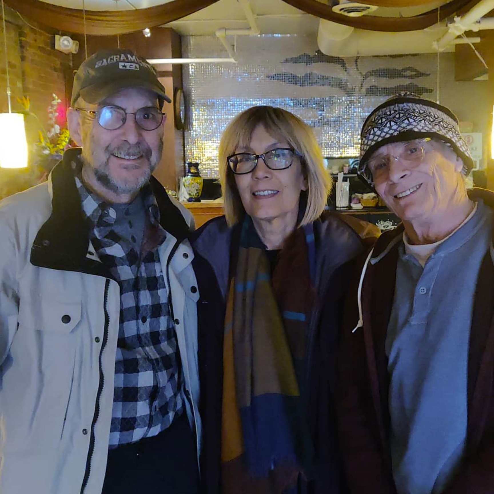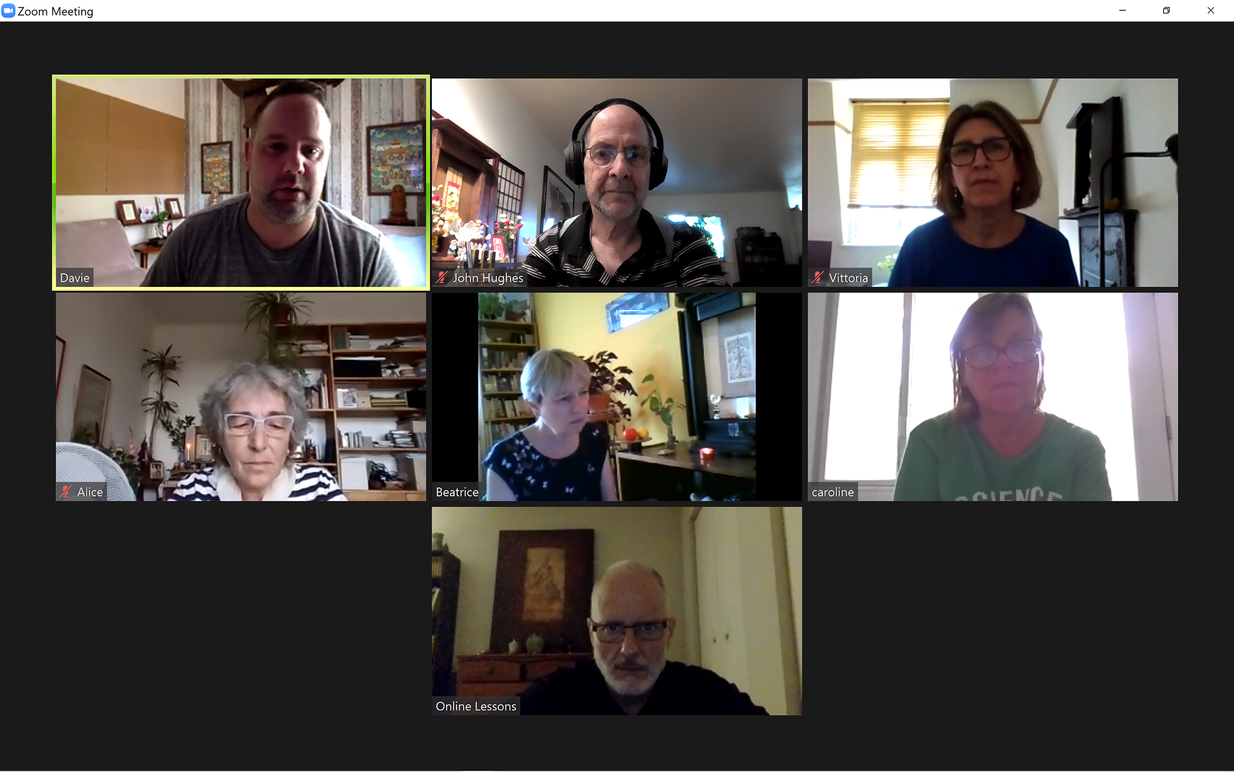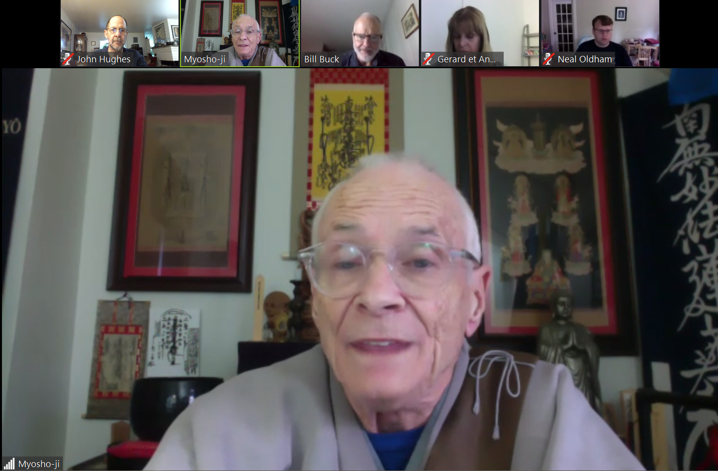 On Nov. 27, 2016, Ryusho created this mandala omamori for me. This and a Kishimojin omamori I purchased from Ryusho became my traveling altar.Screengrab from first service with Ryusho Shonin from Myosho-ji Temple since the move to Syracuse on Feb. 26, 2017.Ryusho Shonin broadcasting April 19, 2017, from his new altar space in Syracuse, NY, during an online discussion of the Shutei Nichiren Shu Hoyo Shiki, the manual that priests and those studying to be priests use.Sunday, March 3, 2019, online service with Rev. Ryusho Jeffus was attended by two couples in France, a young man in England as well as attendees in North Carolina, South Carolina, Iowa and Ohio.On Sept. 15, 2019, Ryusho announced his intention to retire. He outlined his retirement plans. His health, already troublesome, wouldn’t improve.My wife, Mary, and I had lunch with Ryusho Jeffus in Syracuse, NY, on Monday, Nov. 4, 2019A few days after my lunch with Ryusho, he suffered a collapsed lung during a flight from Syracuse to California on his way to visit his brother. The plane made an emergency landing in Arizona. On Nov. 17, 2019, Ryusho hosted an online service from his hospital room.The last time I saw Ryusho in person (at right in this photo) was at Mark Herrick’s Feb. 16, 2020, Tokudo Jukai-shiki cermony in which he became a shami.Then the pandemic hit this year and the nation shut down in March and everyone was learning what Ryusho had demonstrated for years: Zoom keeps you connected.Ryusho was given formal approval by Nichiren Shu headquarters to be the official priest for a group of practitioners in Europe. (Don’t recall exactly when that was. Perhaps in 2019.) He would have his bilingual members translate what he said into French for those who had difficulty with English. This is the crowd from the April 26, 2020, service. Attending are regulars from Portugal, Czech Republic, France, England and the United States.Attendees of the Myoshoji online service July 26, 2020, led by Davie Byden-Oakes in England. This was the day Ryusho’s online sangha learned he was in the hospital.Just a small sample of the artwork Ryusho sent to my wife and me. While he was a strong believer in online technology, he was also old school, mailing his handcrafted cards.