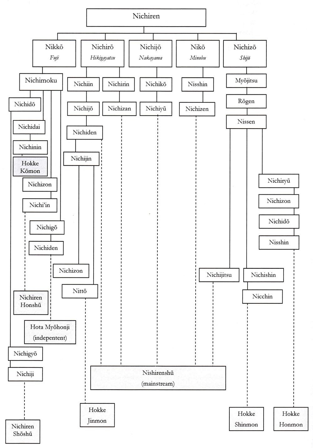 A flowchart illustrating lineages of Nichiren Buddhism. Click to see full image.Shōretsu group