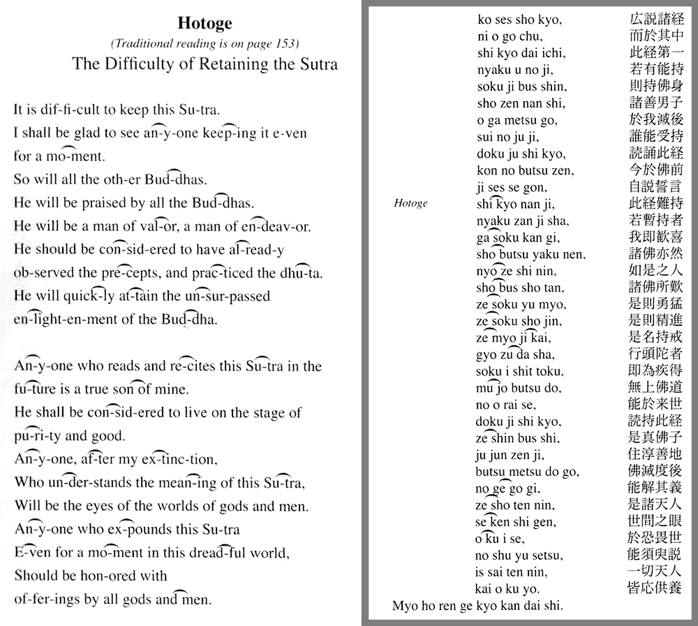 In the grand scheme of things – as in that giant stupa of treasures – something about Many Treasures and his vow and his role proving the veracity of what Sakyamuni has preached in the Lotus Sutra should be the top issue here. If not that, then the wonderful examples of easy and difficult things to do, e.g. the easy task of grasping a Mt. Sumeru and hurling it to a distance of countless Buddha-worlds vs the difficult task of expounding this sutra in the evil world after the Buddha’s extinction. But today I want to reiterate the Hotoge versus and the reason why they are embellished with the odd rhythmic reading.
