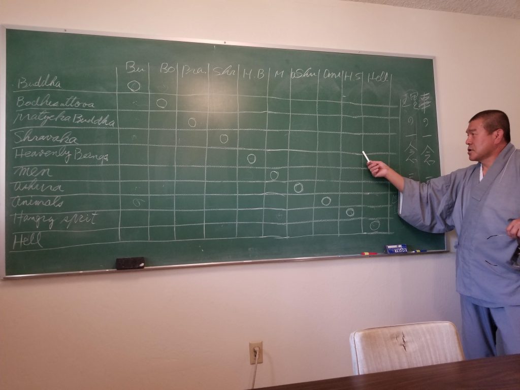 “Today I just explain the logic of Ichinen Sanzen,” Rev. Igarashi begain. “We already know the 10 realms – Buddha, Bodhisattva, Pratyekabuddha, Śrāvaka, Heavingly Beings, Man, Asura, Animals, Hungry Spirits, and Hell. So this is the 10 realms.”