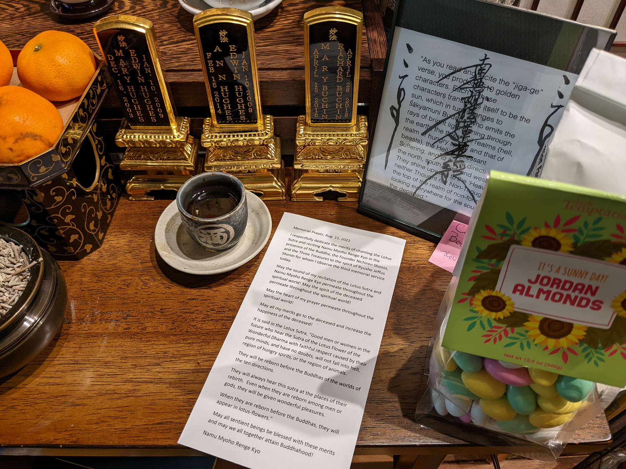For each memorial I create a prayer sheet to read. After the evening service I place the sheet of paper with material to be sent to Rev. Shoda Kanai in Las Vegas to be ritually burned.