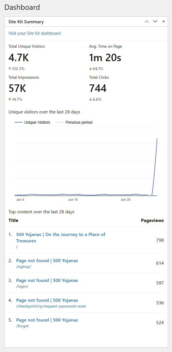 On July 1 500yojanas.org had 40 unique visitors. On July 2, it had 55 unique visitors. On July 3, it had another 55 unique visitors. On Friday, July 4, 3,310 unique visitors tried to hack 500yojanas.org. They looked for a page called signup 614 times. They looked for a login page 597 times. They tried to find a password reset page 536 times. And, best of call, tried to load a page named “forgot” 524 times. These are the “Page not found” efforts. My retelling of The Spider’s Thread had 647 impressions and a biography of Kumarajiva had 658 impressions.