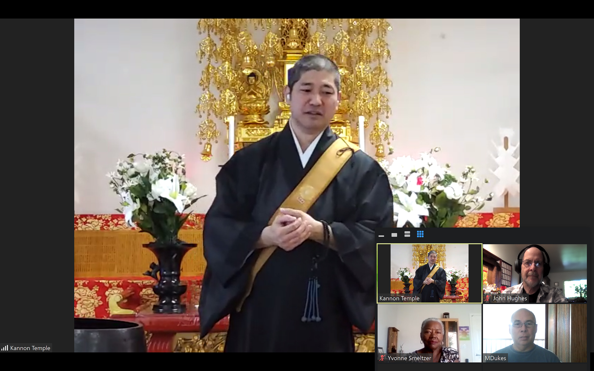 I got up at 6am to do my own personal service so that I would have time to join Rev. Ryusho Jeffus’ Myoshoji service at 7 am. And I was immediately happy I did so because today was the Jukai, Taking of Vows, for two long-time members of Ryusho’s virtual sangha, Davie Byden-Oaks, from London, and Neal Oldham, from North Carolina.